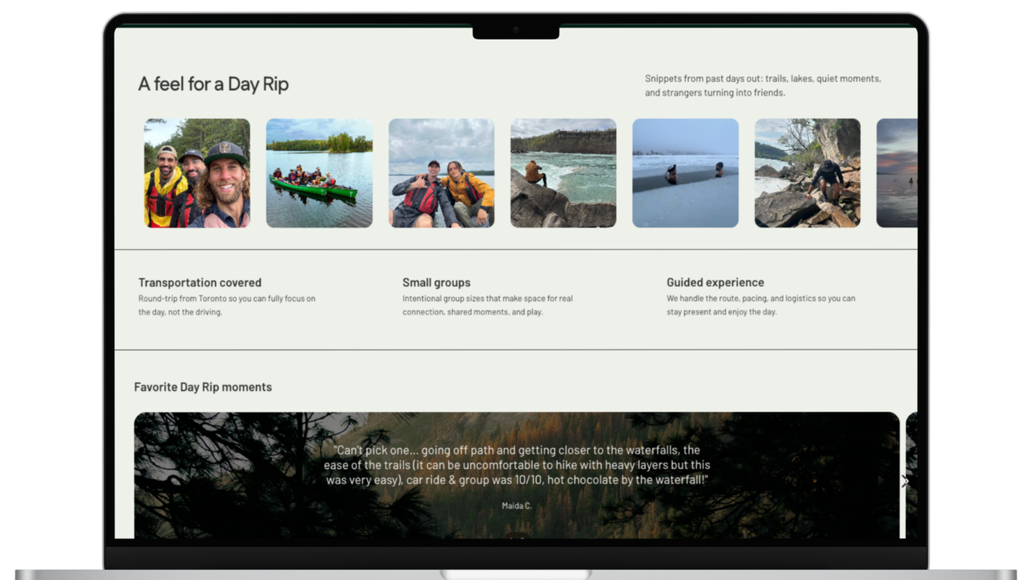 Since Day Rips is a newer concept for many people, the website needed to quickly answer: What is this? Who is it for? Why would I book?